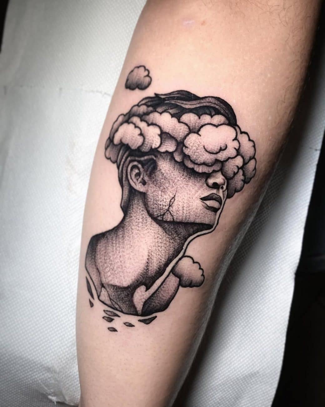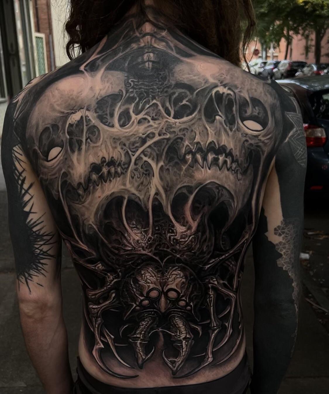 Mroczne tatuaże inspirowane estetyką grozy – czaszki, demony i surrealistyczne wizje, pełne kontrastów i dramatyzmu.